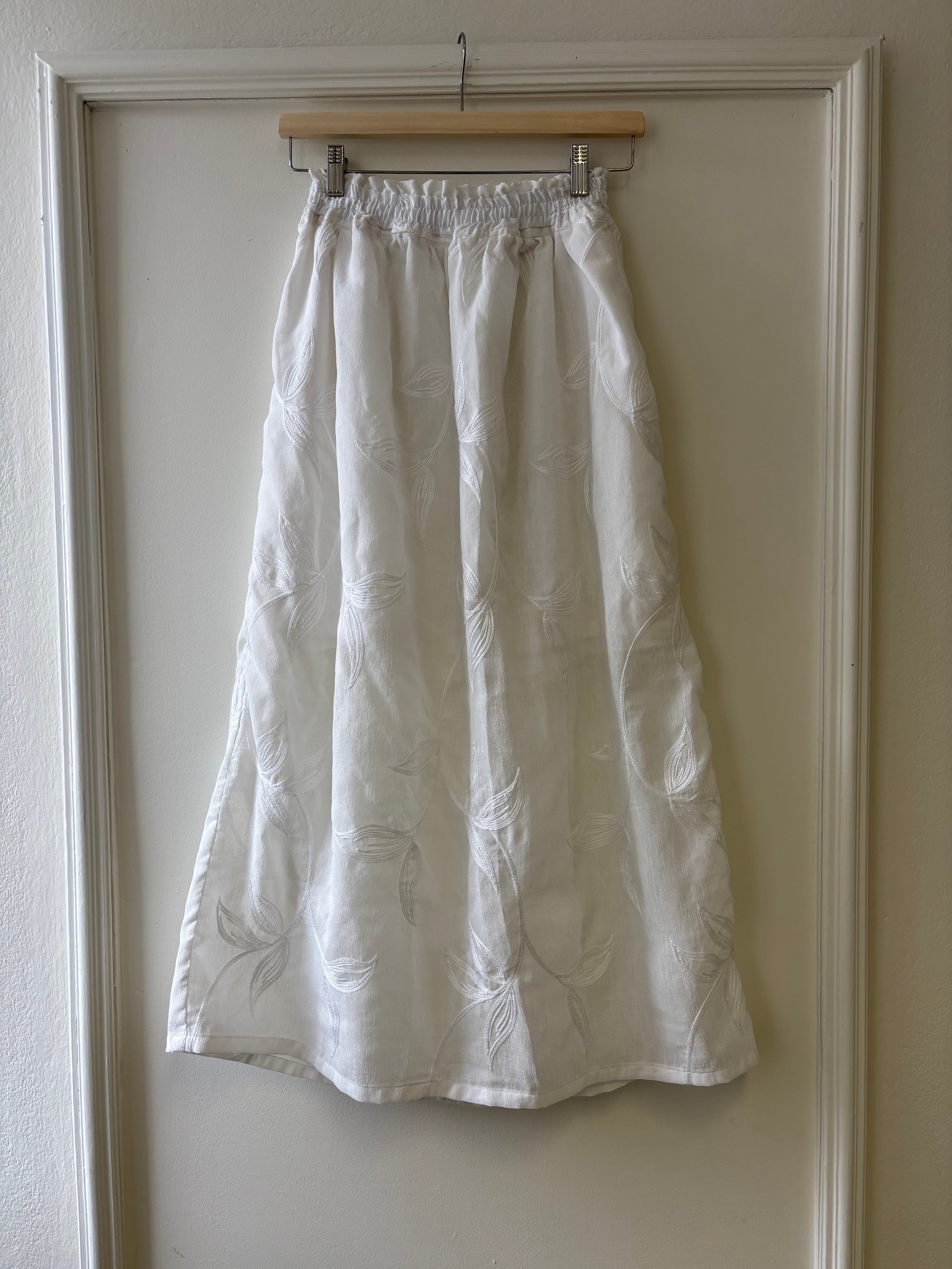 Crafted from a delicate semi-transparent fabric adorned with exquisite white embroidered flowers. The simple yet sophisticated cut, complemented by an elastic waistband, ensures a comfortable and flattering fit. Perfect for a variety of occasions, this skirt is a versatile addition to your wardrobe. Only one available